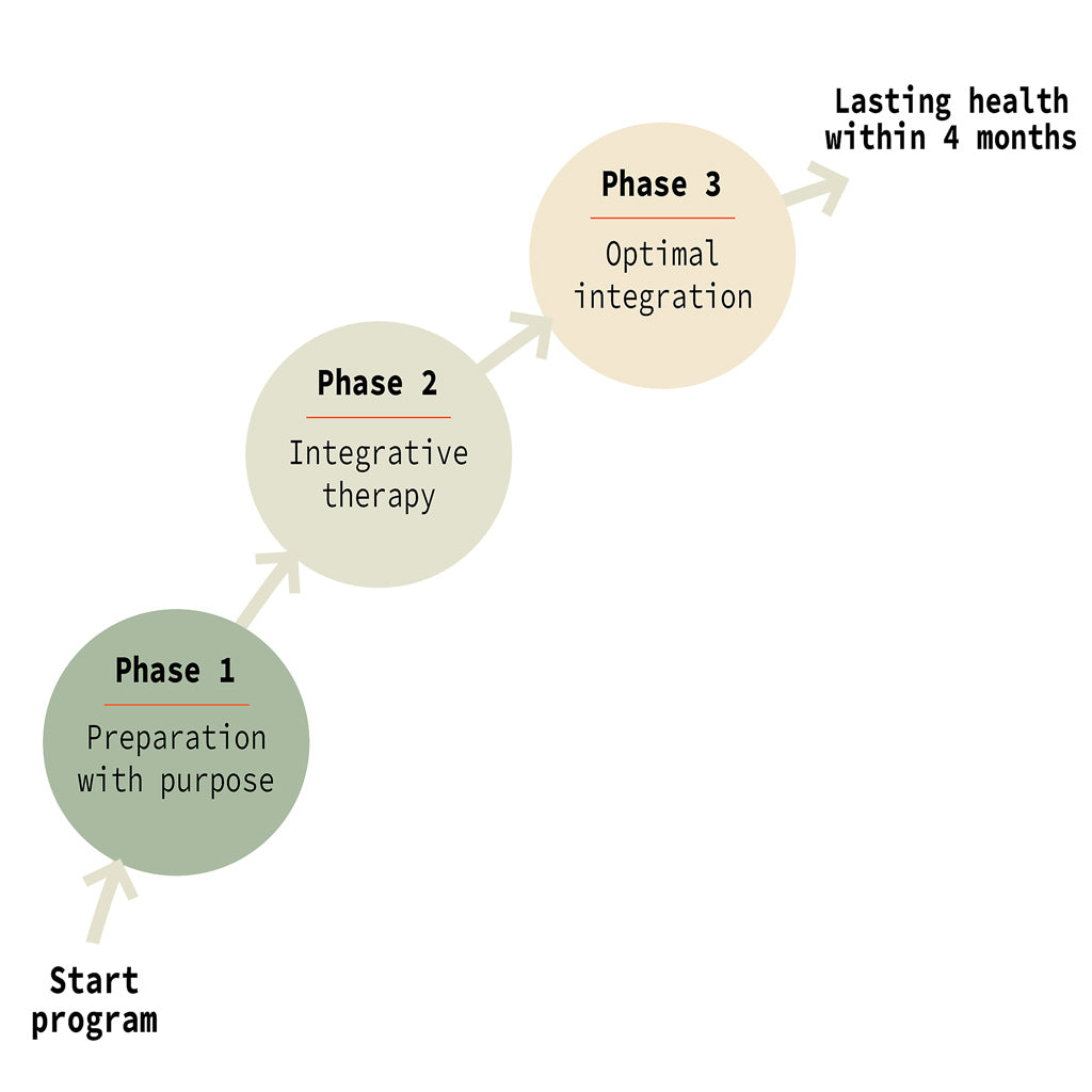 In the subsequent 5-day treatment phase, you will work with your fellow group members and the support team to free yourself from complaints by integrating nutrition, relaxation, meditation, awareness, breathing, and cognitive behavioral training.